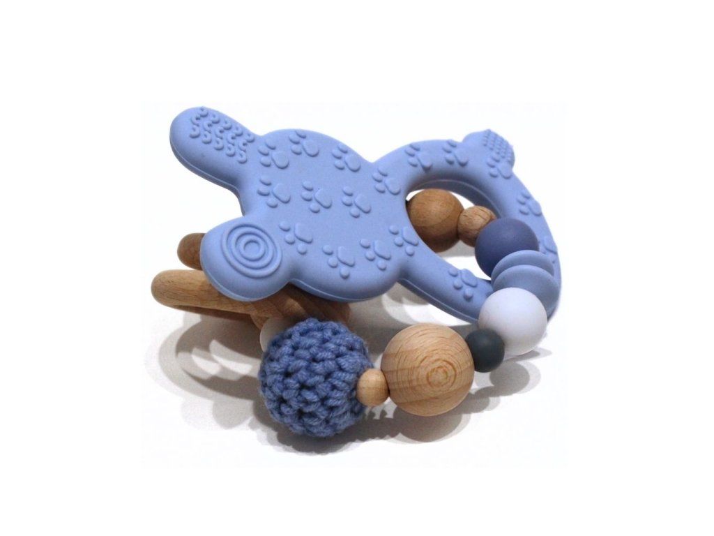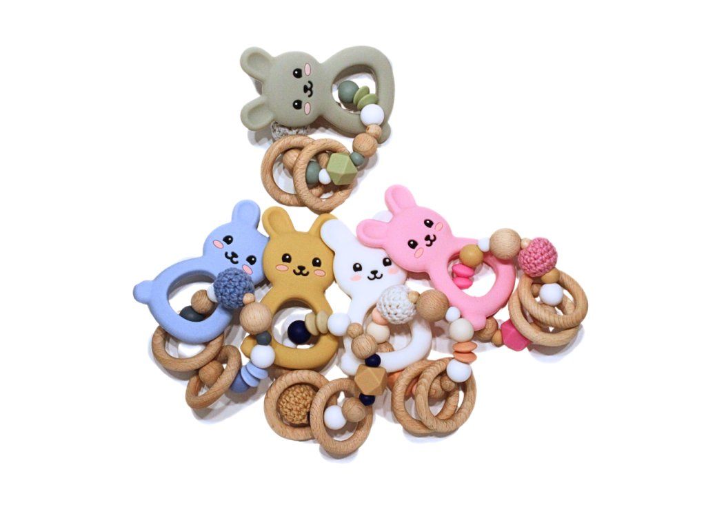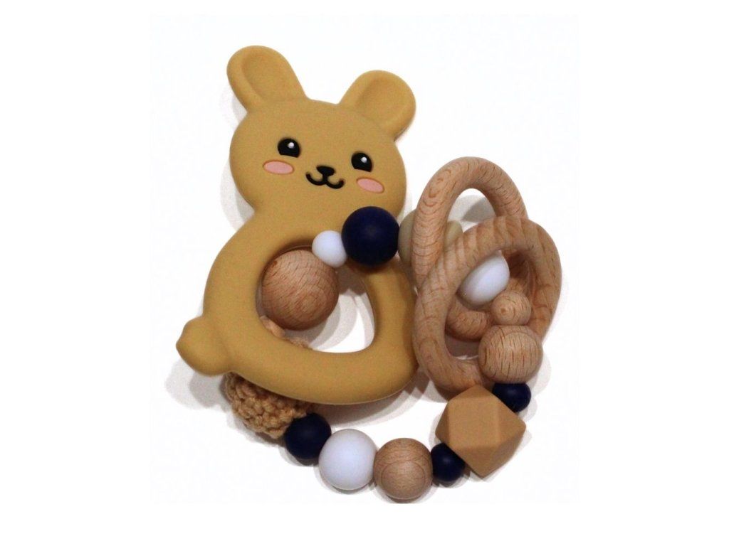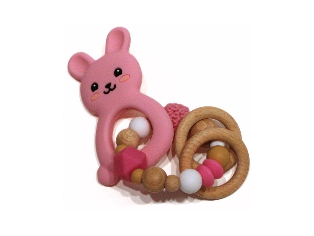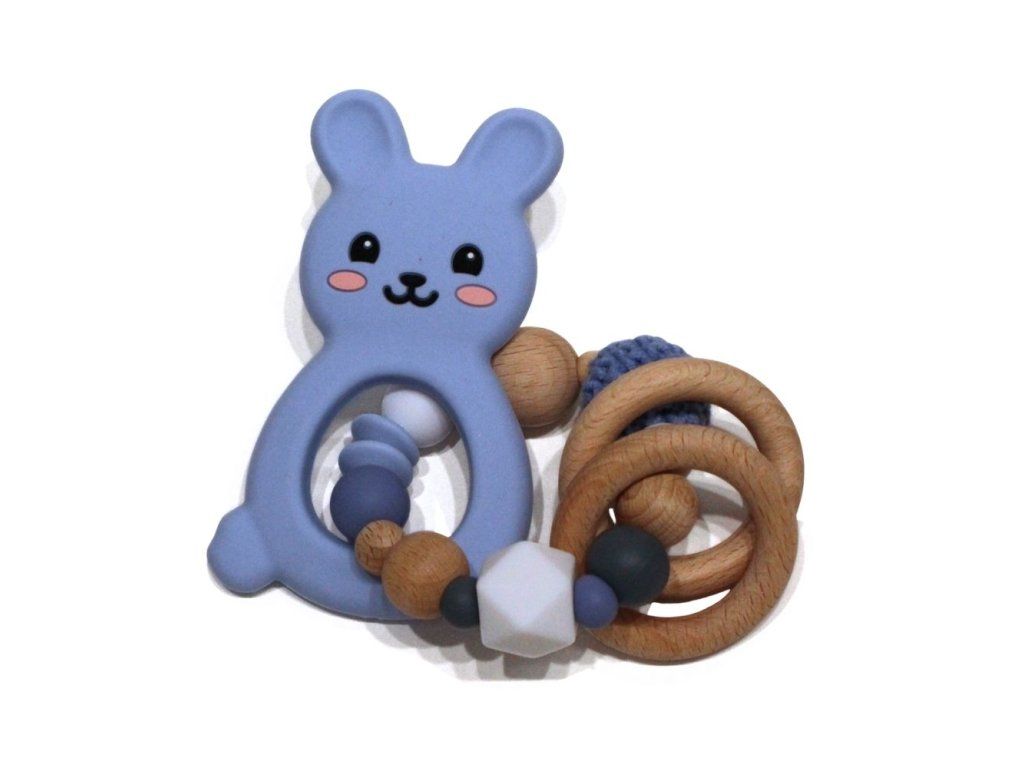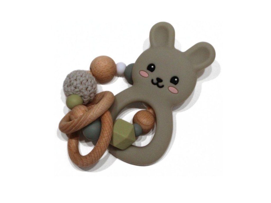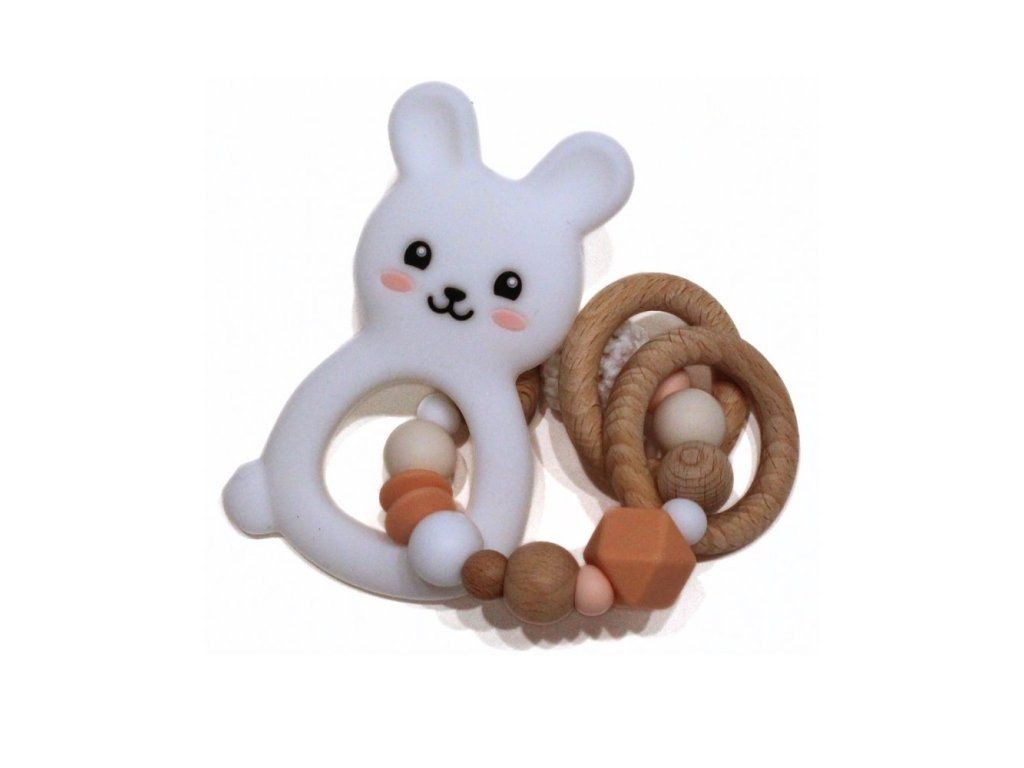 Silikonové kousátko s motivem králíčka z potravinářského silikonu, přírodního bukového dřeva a certifikované bavlny.