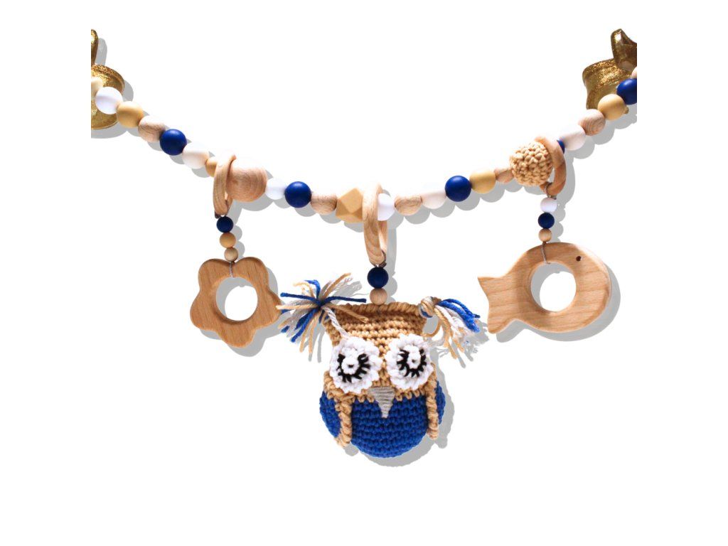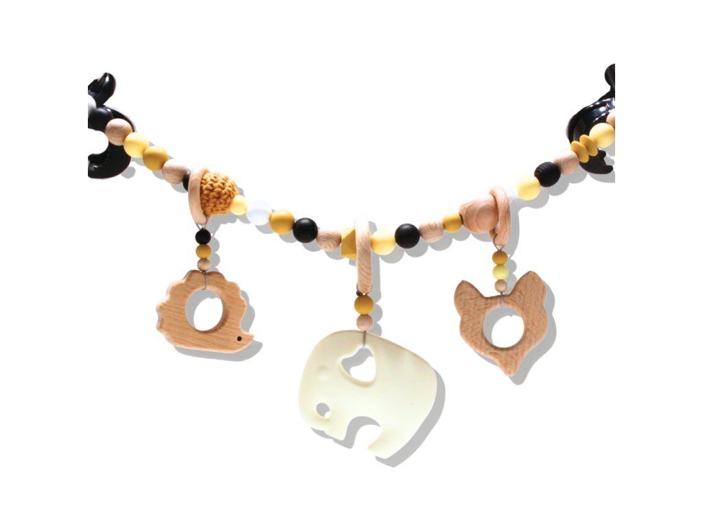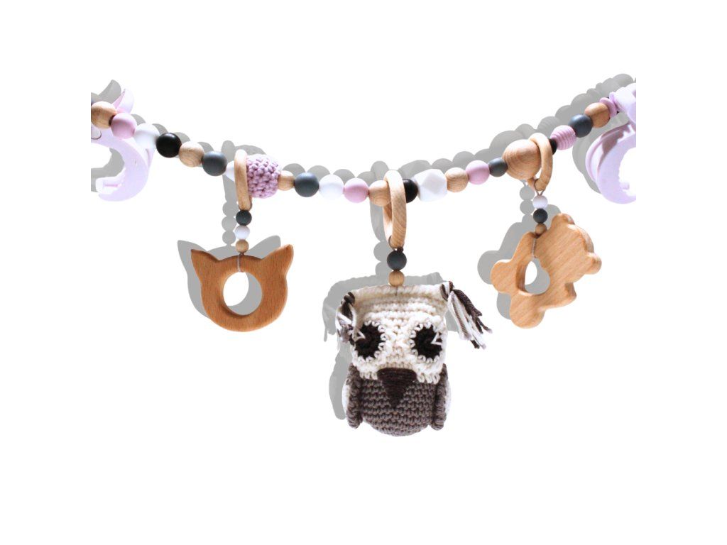 Závěs na kočárek z přírodních materiálů, který se stává součástí prostoru dítěte – jemné podněty pro chvíle, kdy je připoutané a objevuje svět z bezpečí svého místa.