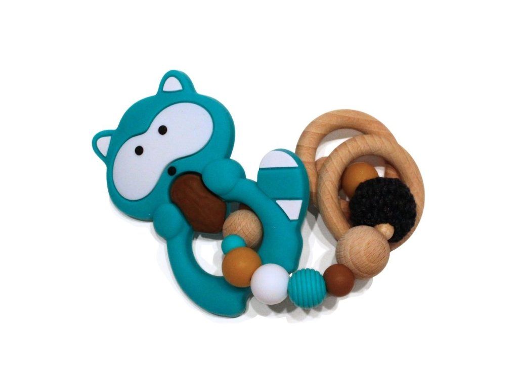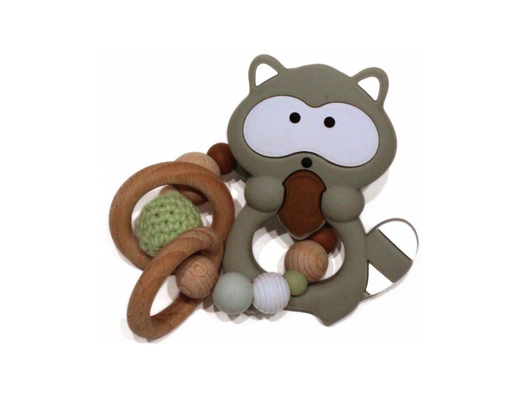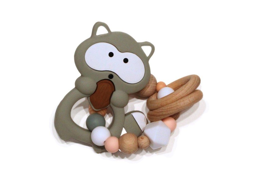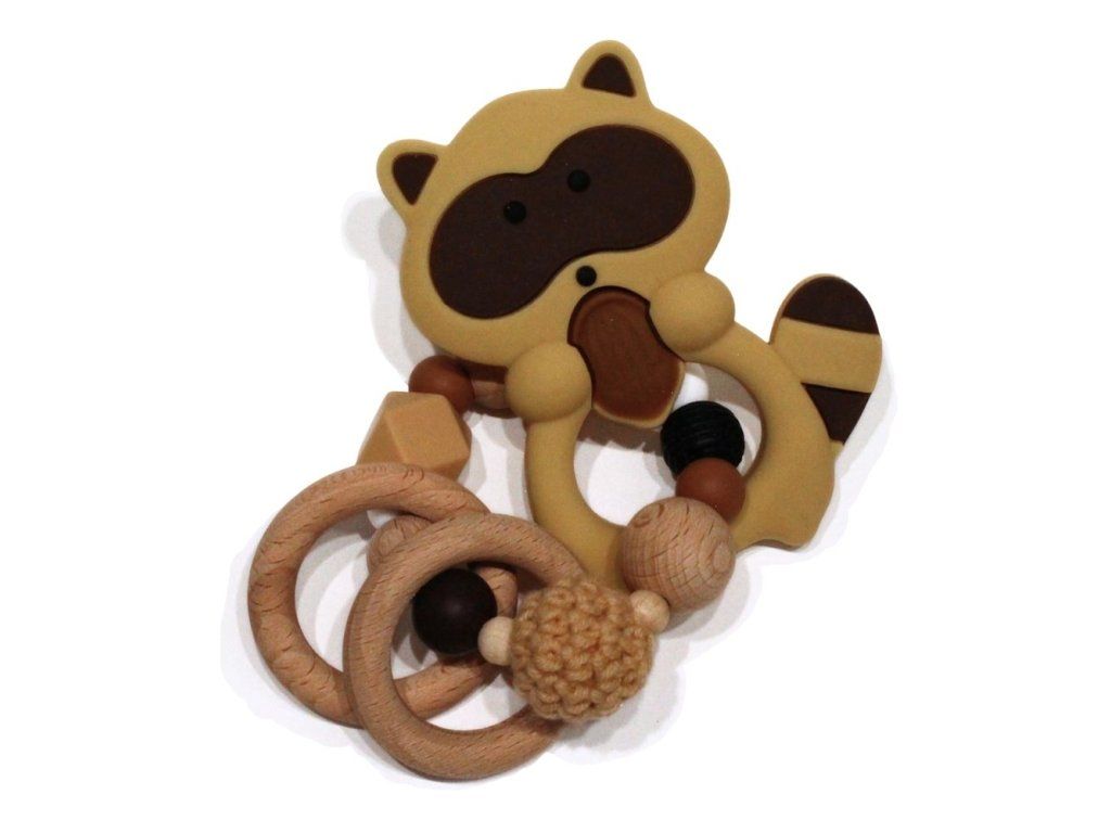 Silikonové kousátko s motivem mývala z potravinářského silikonu, přírodního bukového dřeva a certifikované bavlny.