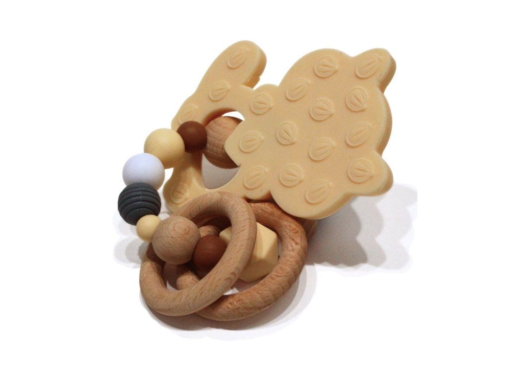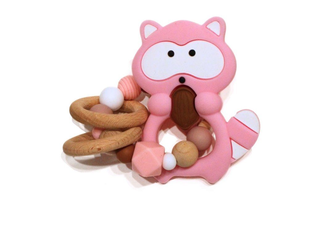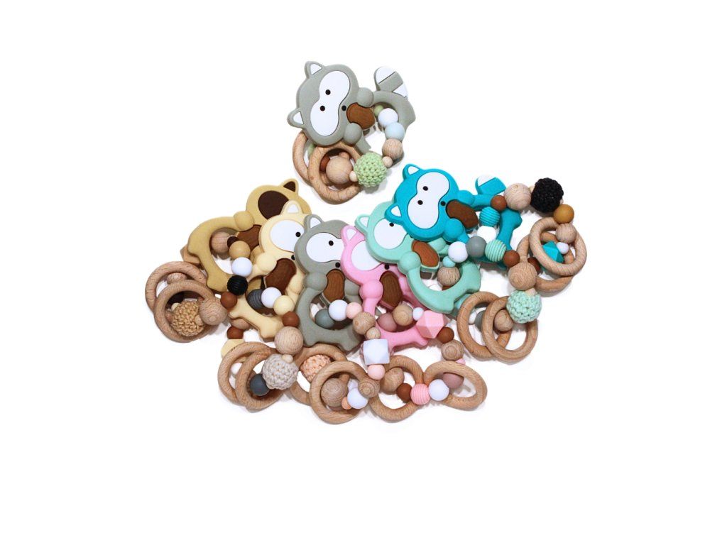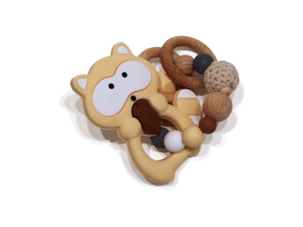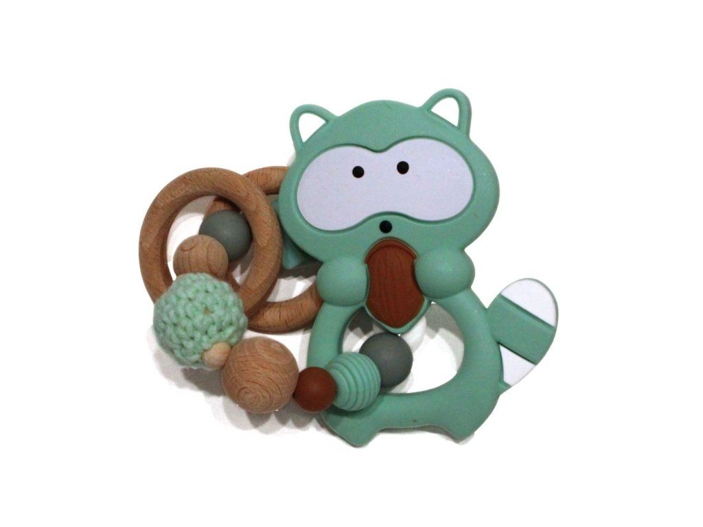 Silikonové kousátko s motivem mývala z potravinářského silikonu, přírodního bukového dřeva a certifikované bavlny.